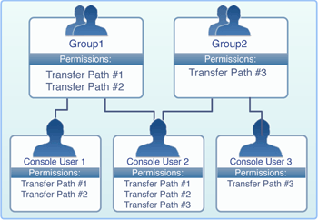 transfer paths, #1 and #2. A Console user inherits transfer permissions from all of the groups
