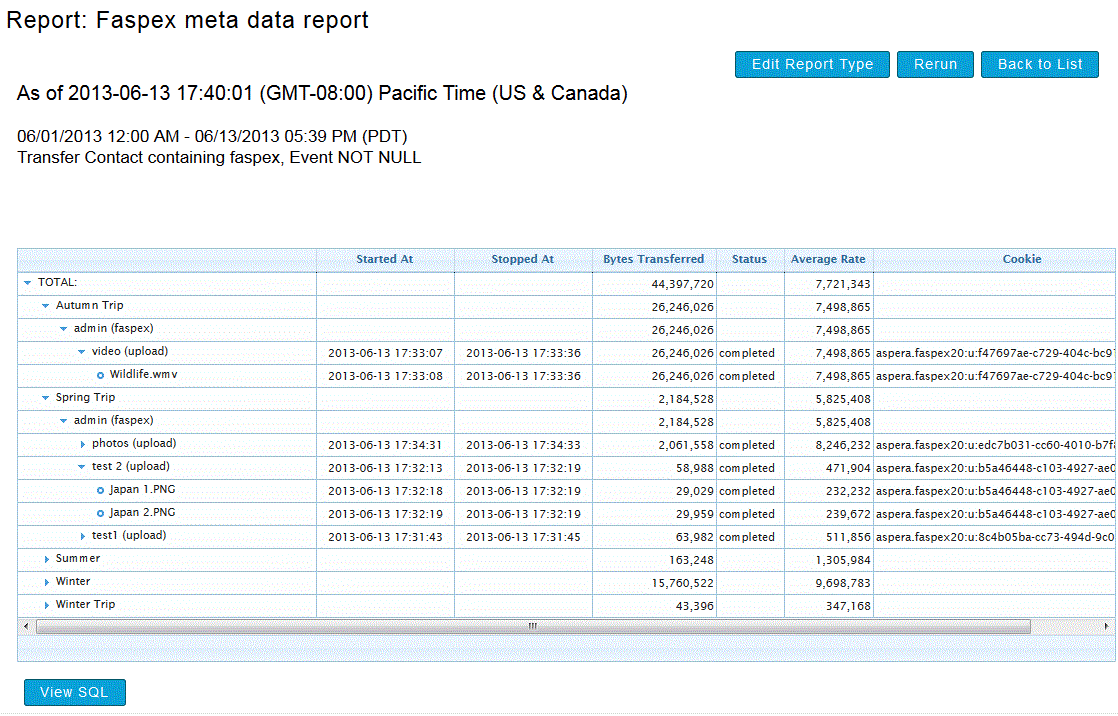 The example report, once generated, will display the purpose (or "Event") of the Faspex package, as well as file-level detail, transfer-level detail (where a transfer groups together transfer sessions into a single item), and which Faspex user sent the package.