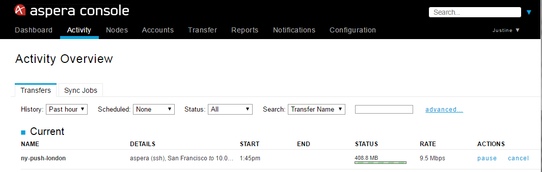 The Sync client reports transfers associated with Sync jobs if <async_management_activity_logging> is set to true in aspera.conf, which is the default configuration. The transfer name is listed as the Sync session name. In the example below, the Sync session "ny-push-london" is reported under Transfers.