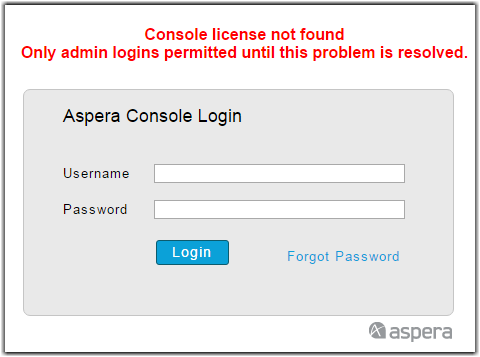 IBM Aspera Console requires a valid license key before you can configure users and send or receive packages. If your Console license has expired or cannot be found, the Console login screen displays the following message: