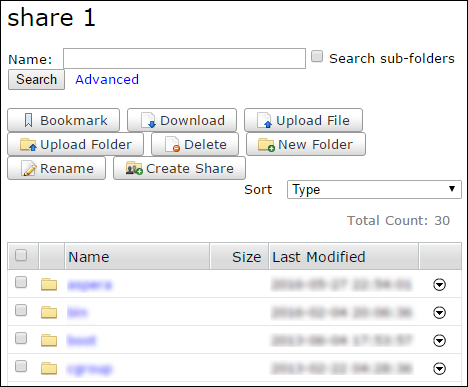 The name of the share appears at the top. The search bar enables you to search for specific files or directories (for more information, see Searching Nodes and Shares). When you select a file or directory in the share, you can click one of the buttons (for example, Bookmark) to act on the share. Total Count displays the total number of entries (files and directories) in the current share.