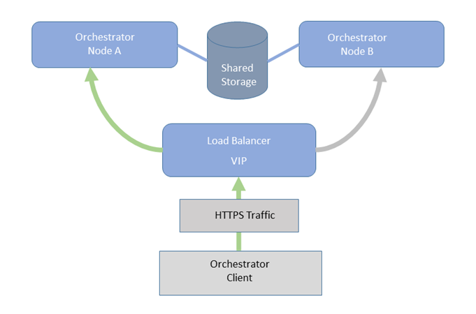 The load balancer is provisioned with a virtual IP address (VIP) for user access; which it uses to manage all traffic related to the Orchestrator service. A fully qualified domain name (FQDN) ―typically orchestrator.mydomain.com―is used to access the Orchestrator service and points to the VIP of the load balancer.