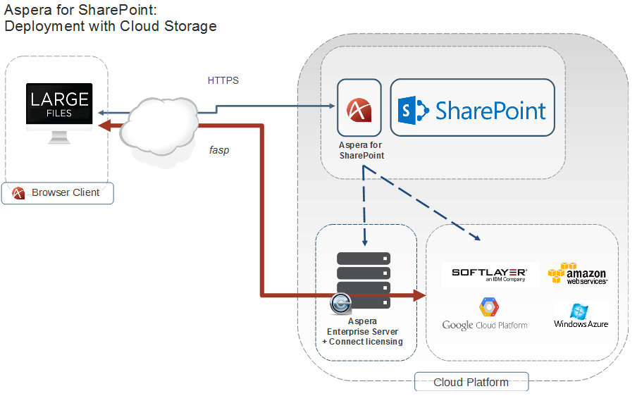 Aspera for SharePoint uses the Aspera FASP® protocol and the Aspera transfer server platform to move large datasets quickly and securely. It is a high-trust application that integrates closely into SharePoint with little or no change to your existing SharePoint workflows.