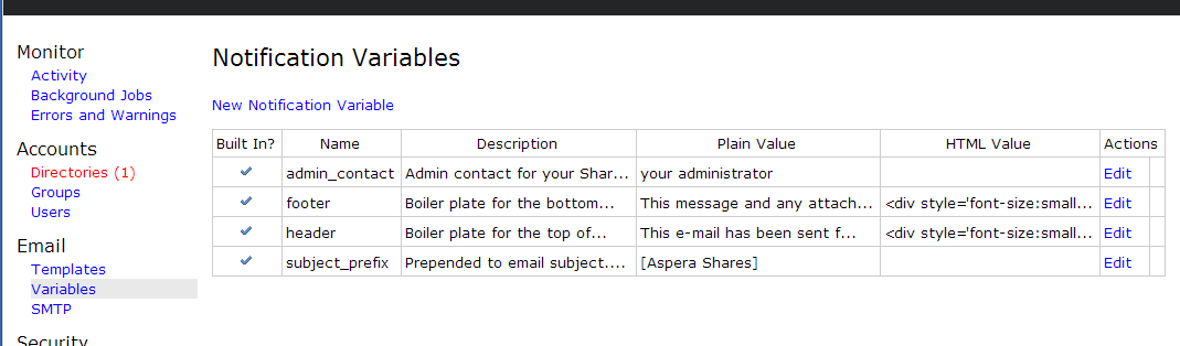 You can create or modify variables to be inserted in your IBM Aspera Shares notification templates.