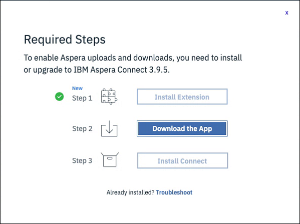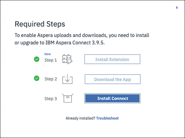 - Guided Installation: The most common way of installing Connect. If Connect is not installed or needs upgrading when you try to upload or download files from an Aspera web app, such as Aspera Faspex or Aspera Shares, you are prompted to install Connect and guided through the process.