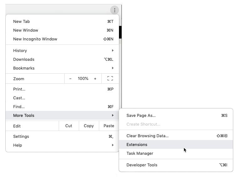 In the drop-down menu that opens, choose More Tools > Extensions: