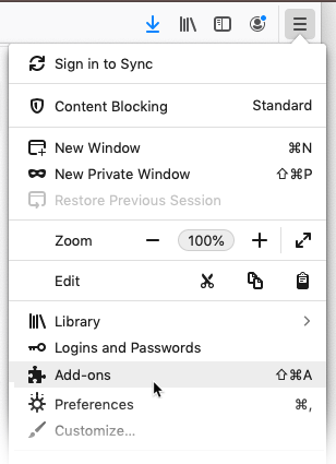 To remove the Connect extension for Firefox, open the three-bar icon in the upper right corner of the browser window, and click Add-ons: