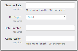 In the example metadata file below, the Audio Details metadata profile contains the following fields:- Sample rate (text input field)