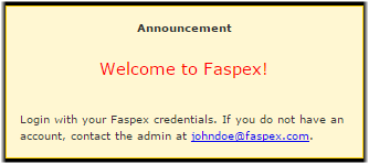 Posting Announcements on the Login Page Post an announcement on the login page to welcome users and provide further login information. Go to Server > Notifications > Login Announcement. Enter your announcement. You can use HTML tags and CSS classes in your instructions. For a list of available tags, see Available HTML Tags and Attributes in Faspex. For more information on using CSS classes, see Creating CSS Classes to Use in Instructions. For example:<h1 class="red" style="text-align:center">Welcome to Faspex!</h1> Login with your Faspex credentials. If you do not have an account, contact the admin at <a href="mailto:johndoe@faspex.com">johndoe@faspex.com</a>.