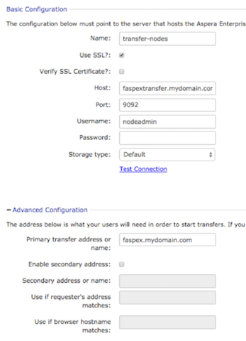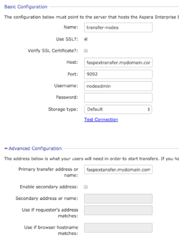 Note: If you don’t have a valid FQDN resolving into a list of several IP addresses, it is also possible to use a name defined by several entries in the /etc/hosts file on both nodes (see Using /etc/hosts Entries to Poll Transfer Nodes).Port Typically 9092 Username nodeadmin Password The password you entered when you created the nodeadmin user (using the asnodeadmin command). Primary transfer address or name (expand Advanced Configuration) If you chose to use Type 1 architecture, use the VIP or a FQDN pointing to the VIP (typically something like faspex.mydomain.com).