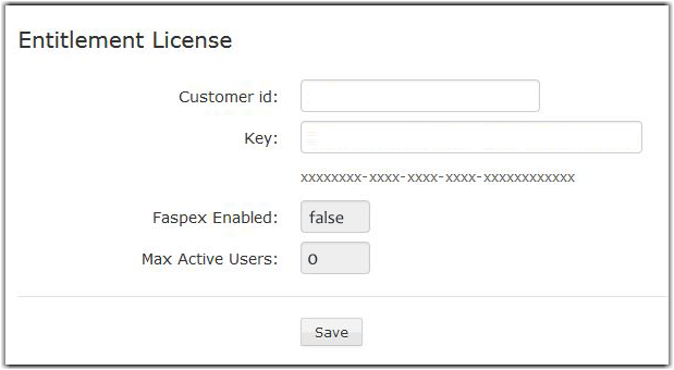 The Entitlement License page opens. Enter your customer ID and entitlement key, and click Save. Until you provide a valid license, you will be unable to use Faspex On Demand. For more information on updating your entitlement key, see Updating the Entitlement Key.