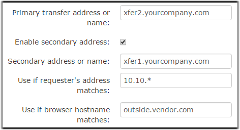 | Use if browser hostname matches: | Set a condition that the requested browser hostname or IP address must match this value for the secondary transfer address to be used. For an IP address, the value can be a range of addresses; e.g., 10.0.176.*. | "outside.vendor.com" |