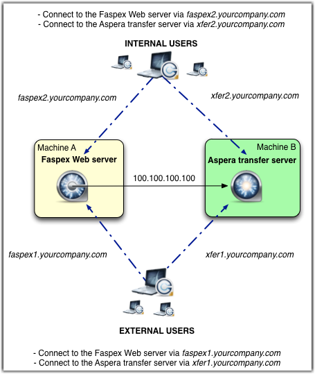 For a streamlined installation, your transfer server address, by default, is 127.0.0.1, because IBM Aspera Faspex on Demand is installed on the same machine as your transfer server (i.e., IBM Aspera Enterprise Server or IBM Aspera Connect Server v3.0+). To run your transfer server on a different machine, you need to tell the Faspex web server where that machine is located so that Faspex can gather transfer statistics and display them via the Web UI. Consider the configuration in the following example: