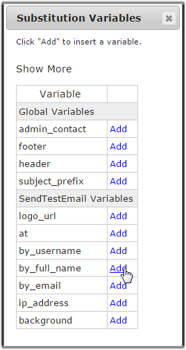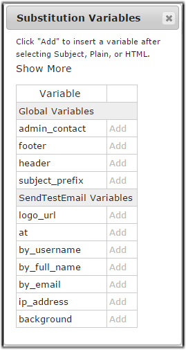 To use variables in a template, click Template Substitution Variables at the bottom of the page. This opens the Substitution Variables dialog showing a list of variables that are available for this template. To see descriptions of each variable, click Show More.